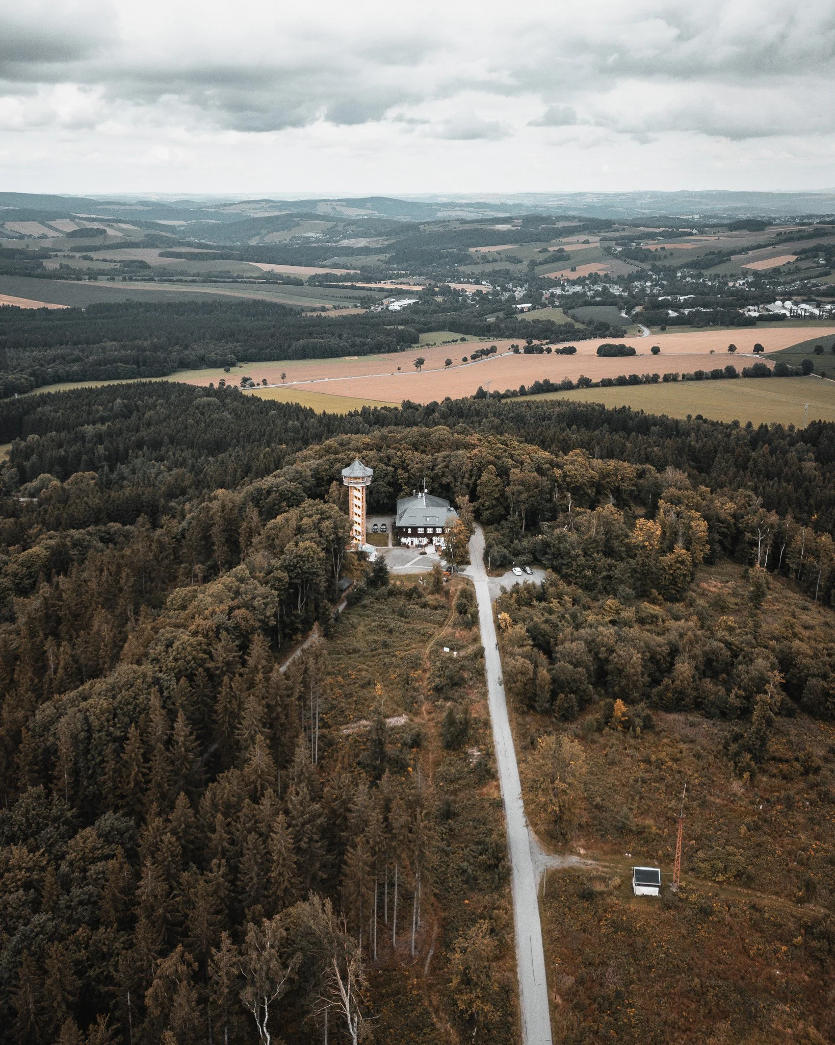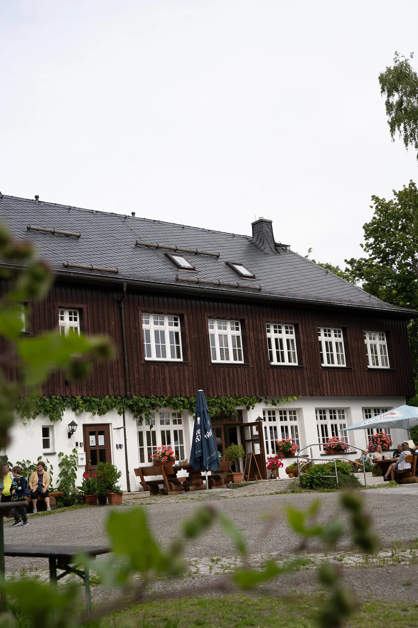 Oben an der Morgensonne angekommen, wurden wir mit einem fantastischen Weitblick über das Erzgebirge belohnt. Wir machten hier eine kurze Pause und die Drohne kam zum Einsatz. Dann ging es kaffeedurstig zum Bürger- und Berggasthaus Scheibenberg. Nach der ersten Wanderetappe hatten wir uns das redlich verdient und belohnet uns direkt mit einem ehrlichen Stück hausgemachten Kuchen und einer Tasse Kaffee im Freisitz vor dem Lokal. Bei herzlicher Atmosphäre fand Manni unter der Eckbank sofort ein ruhiges Plätzchen für ein kurzes Nickerchen.