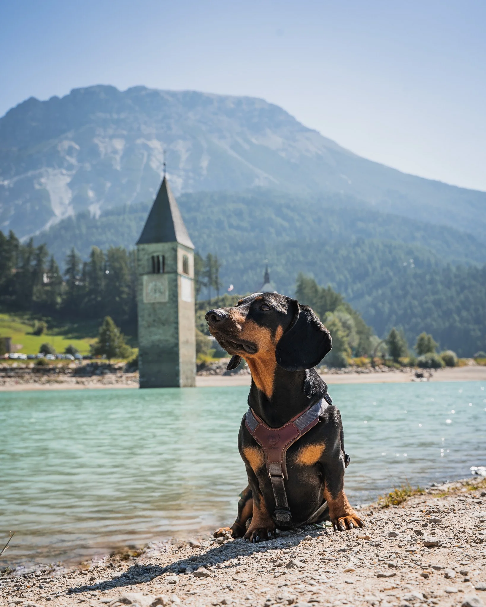 Das absolute Wahrzeichen des Vinschgaus ist der aus dem See ragende Kirchturm von Alt-Graun. Eine Umrundung des Sees umfasst ca. 15,3 km auf einem fast durchgehend flachen, gut ausgebauten Weg. Ihr wandert dabei stets in unmittelbarer Nähe zum Ufer und habt die vergletscherten Gipfel der Ortlergruppe im Blick. Da der Reschenpass als Windschneise bekannt ist, herrscht hier selbst im Sommer oft eine kräftige, kühlende Brise – ideal für lauffreudige Hunde, die bei Hitze schnell ermüden. Der Weg ist auch bei Radfahrern sehr beliebt, weshalb eine gute Leinenführung wichtig ist. An vielen Stellen gibt es flache Uferbereiche, an denen euer Hund gefahrlos trinken oder die Pfoten kühlen kann. Wer nicht die ganze Runde schafft, kann den See auch mit dem Schiff "MS Hubertus" überqueren (Maulkorbpflicht beachten).